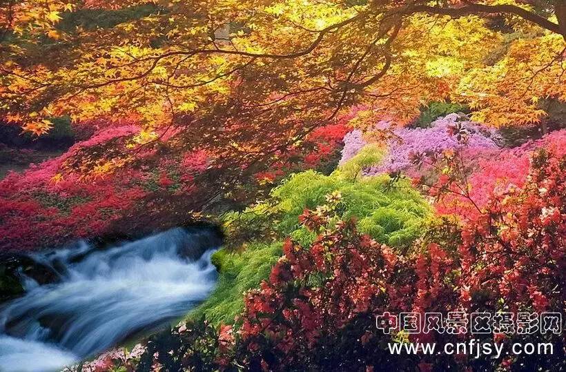 空山新雨后,天气晚来秋,这里没有气势恢宏的场景,只有五颜六色,色彩斑斓的各种树叶和流水声定格在画面中,这些元素很好的衬托对秋天的眷恋,好似一幅西方画家莫奈对色彩追寻。用慢门的手法表现流水的动感,一静一动让画面更具美感。不足是构图有些满及噪点。